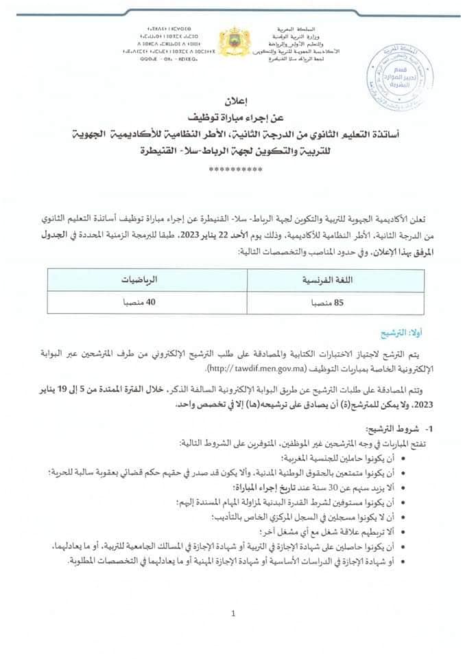 مباراة توظيف 125 أساتذة التعليم الثانوي من الدرجة الثانية - الأطر النظامية للأكاديمية الجهوية للتربية والتكوين لجهة الرباط سلا القنيطرة آخر أجل هو19 يناير 2023